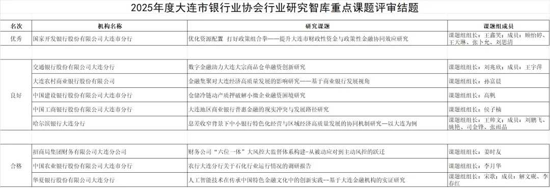 为进一步发挥协会智库“行业智囊”作用,为我市银行业高质量发展提供智力支撑,大连市银行业协会发展研究工作委员会组织开展了2025年度行业研究智库重点课题研究工作。此项工作得到了行业研究智库专家成员高度重视,9位智库专家分别牵头组成课题组开展调查研究,共提交研究成果9篇。经行业发展研究工作委员会综合鉴定,最终确定1篇为优秀研究成果,5篇为良好研究成果,3篇为合格研究成果(名单附后),现将评选结果予以通报